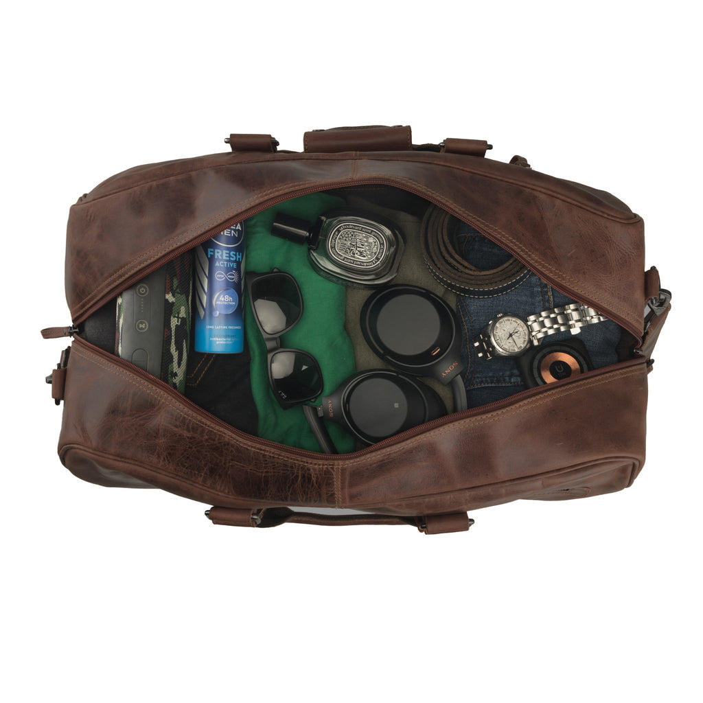 The Hudson Duffle Bag by Minori Leather is built for travelers who refuse to compromise on style. Crafted from premium full-grain wax oil pull-up leather, this spacious duffle handles everything from weekend getaways to extended adventures with understated sophistication. Multiple compartments—including a main zippered section, front and back pockets, plus an internal organizer—keep your gear sorted without the headache. Adjustable 65" strap and reinforced handles make it equally comfortable slung over your shoulder or grabbed in a rush. Heritage-inspired design meets modern practicality.