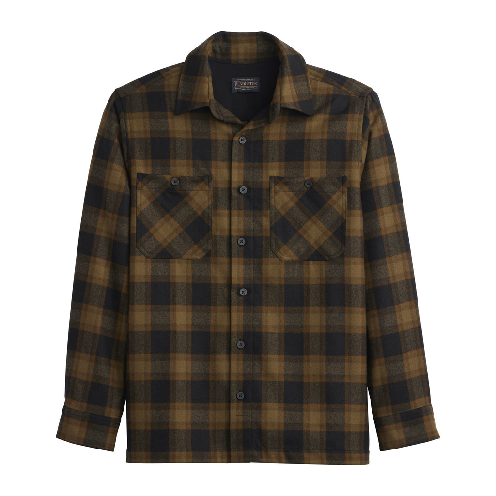 Crafted from premium, machine-washable virgin wool sourced from local ranchers near our Pendleton mill in Umatilla County, Oregon, this shirt offers rugged durability with a midweight fabric that's water, odor, and stain-resistant. Featuring a square bottom and two flap chest pockets, it combines practical design with authentic American craftsmanship. Perfect for everyday wear, this olive and black check work shirt blends comfort and reliability seamlessly.