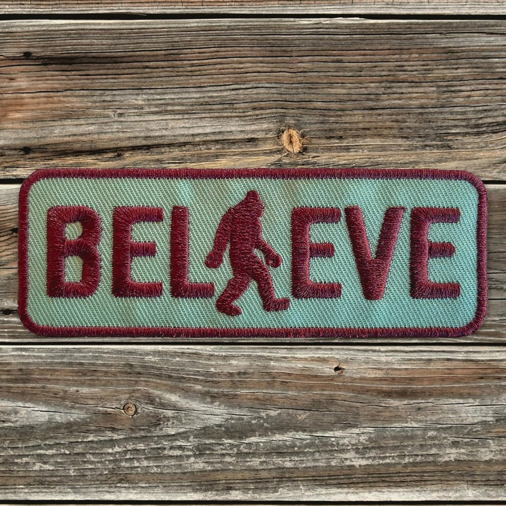 "BELIEVE" Retro Walking Sasquatch Embroidered Bigfoot Patch - Iron-On Patch 4" x 1.5" - Great for Trucker Hats. Perfect for those who love yeti, sasquatch, bigfoot, cryptids and the great outdoors! Show your cryptid pride with this embroidered Bigfoot “BELIEVE” patch, featuring the iconic silhouette of Sasquatch. Perfect for yeti fans, outdoor adventurers, and lovers of Bigfoot lore, this patch adds a touch of mystery and fun to jackets, backpacks, hats, or gear.