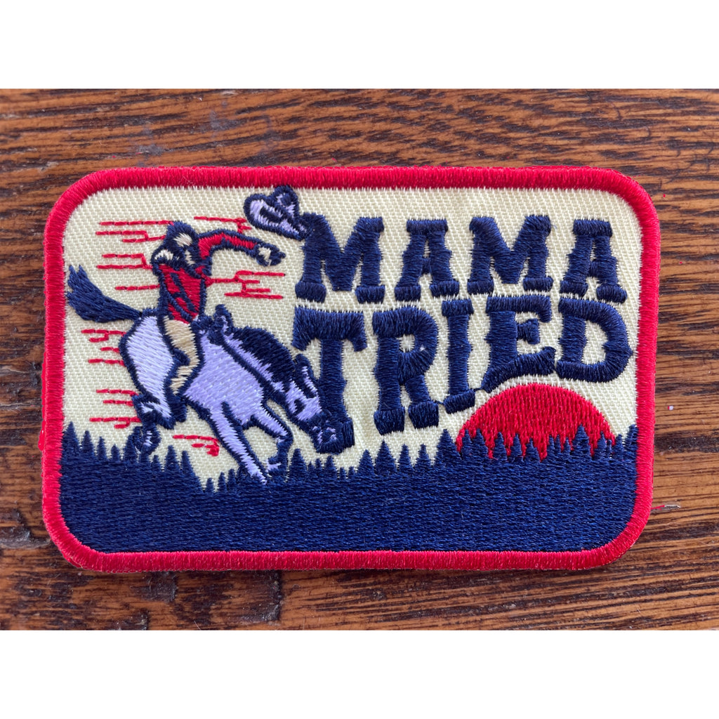 "Mama Tried" Western Style Vintage Cowboy Embroidered Patch Add authentic country flair to your favorite gear with this classic embroidered patch inspired by outlaw country culture. Featuring vintage cowboy styling, this patch comes with convenient iron-on backing for easy application to trucker hats, backpacks, jackets, and more. Perfect for fans of classic country music and western aesthetics who want to personalize their everyday wear.